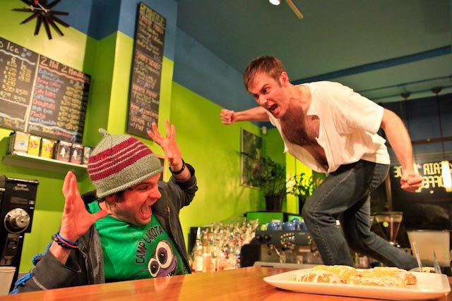 "Without a doubt, one can arrive unprepared for Joe Zarrow's new play, The Pigeons, produced by Walkabout Theater, at Swim Cafe's space. It's easily the cleverest, foxiest and physically wildest farce I've seen since, well, forever."